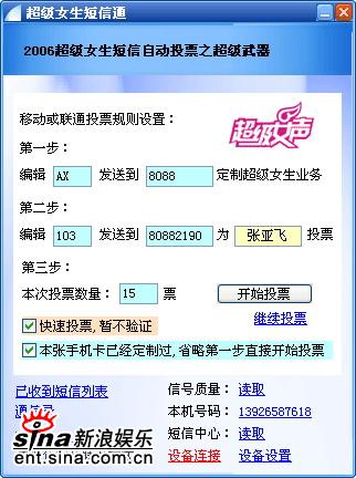 发送速度最高700条/小时,一次发送1张卡,如果按照一张卡投15票计算,每小时可投20-30张,既300-450票。